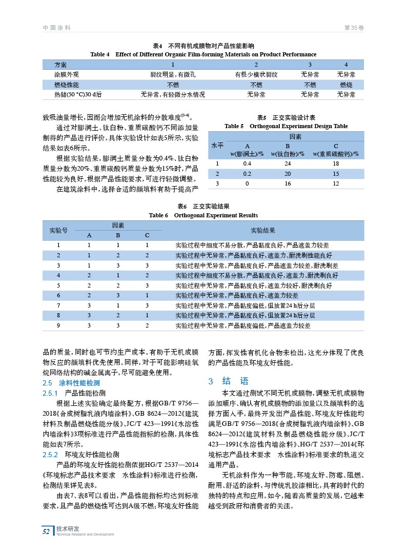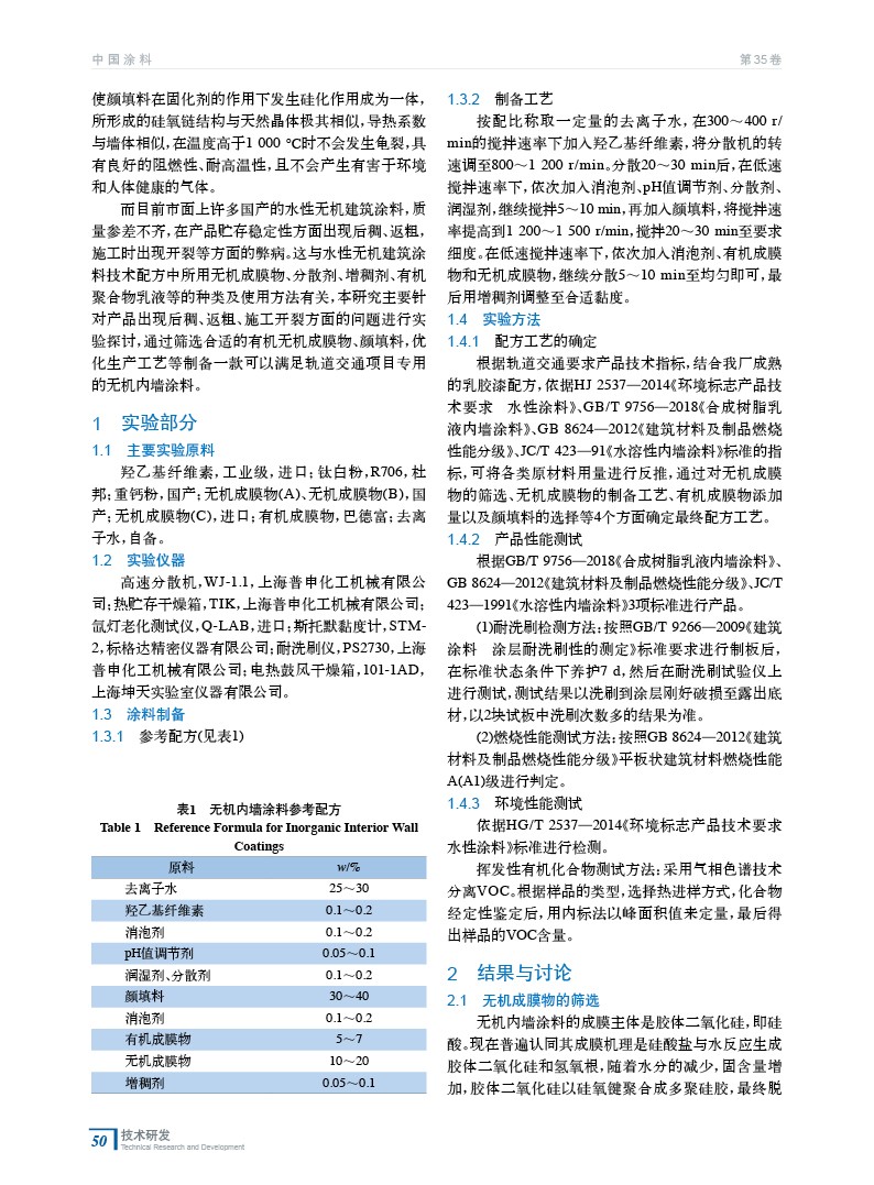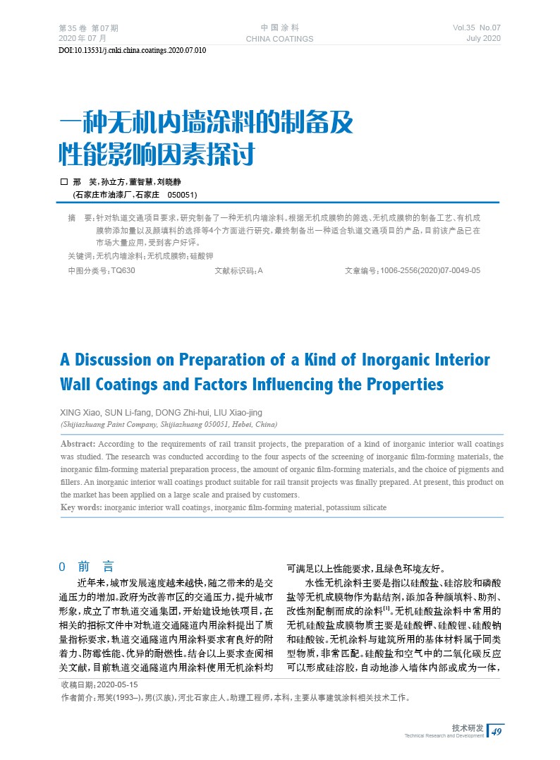 針對軌道交通項目要求,研究制備了一種無機內墻涂料。根據無機成膜物的篩選、無機成膜物的制備工藝、有機成膜物添加量以及顏填料的選擇等4個方面進行研究,最終制備出一種適合軌道交通項目的產品,目前該產品已在市場大量應用,受到客戶好評。