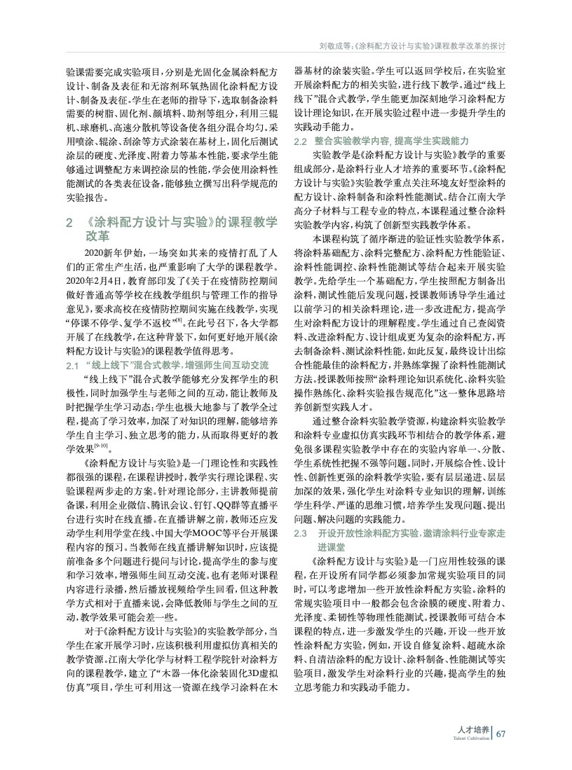 分析了《涂料配方設計與實驗》這門課程的特點及存在的問題,以提高課程教學質量為主要目標,探討新冠疫情背景下引入新的教學模式,如采用“線上線下”混合式教學,并優化課程的教學內容和考核方式,為涂料行業培養更多具有專業知識和實踐能力的高素質人才。