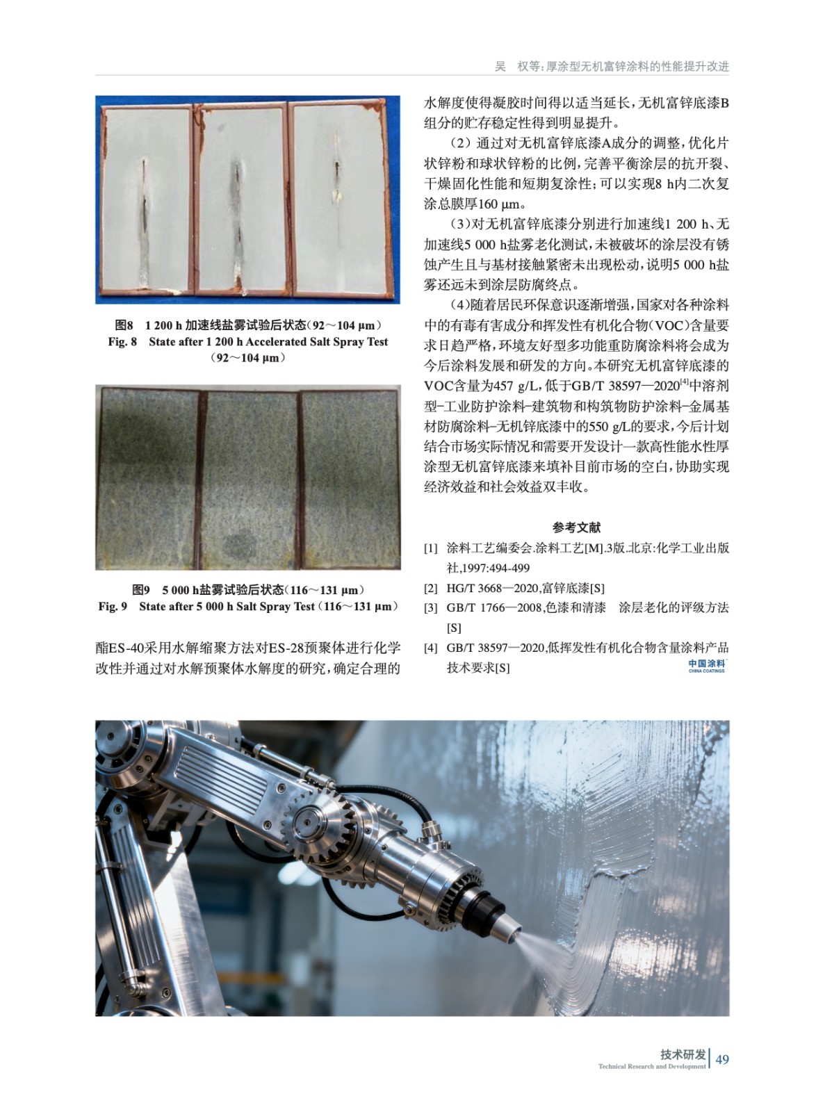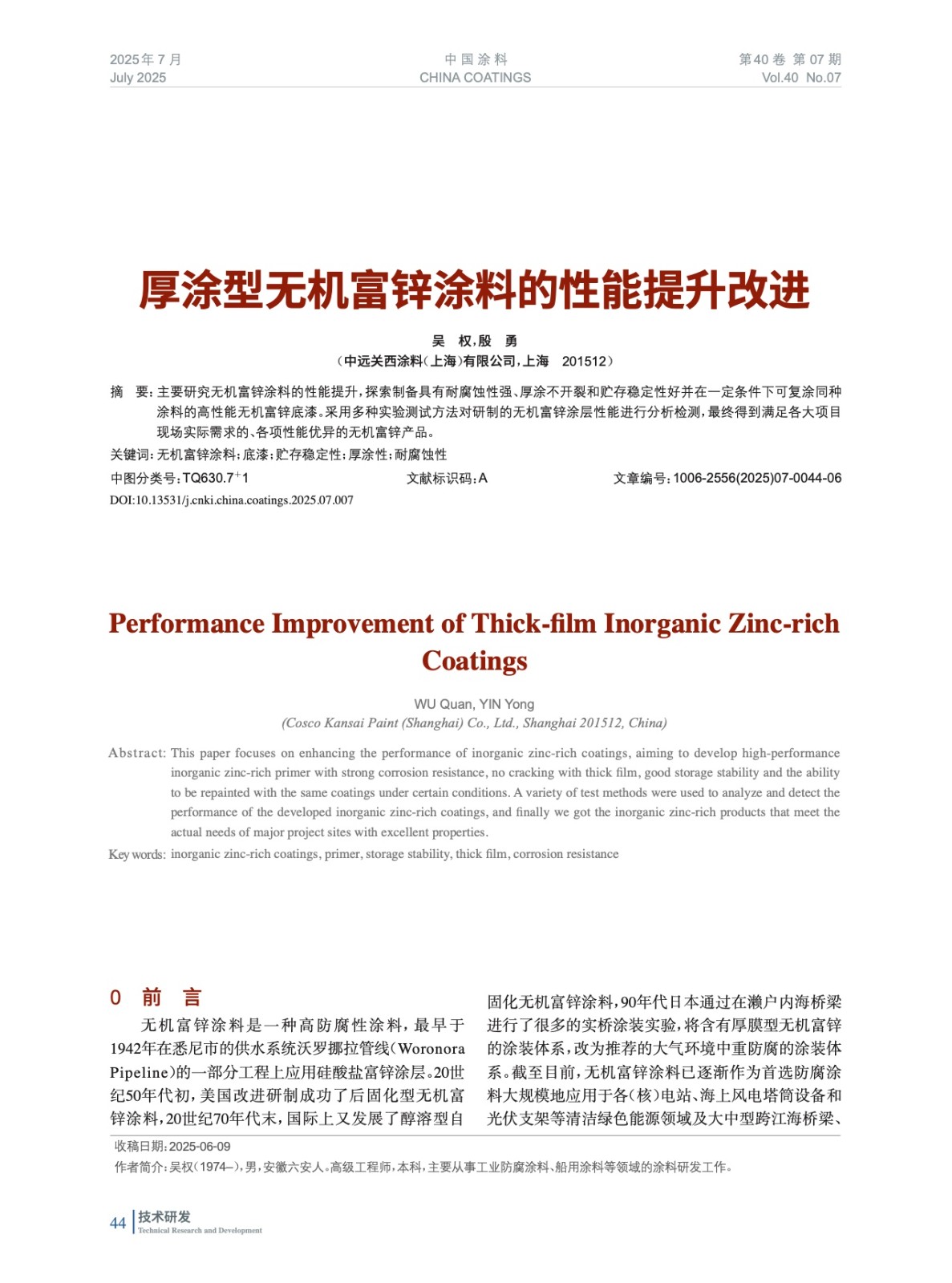 主要研究無機富鋅涂料的性能提升,探索制備具有耐腐蝕性強、厚涂不開裂和貯存穩定性好并在一定條件下可復涂同種涂料的高性能無機富鋅底漆。采用多種實驗測試方法對研制的無機富鋅涂層性能進行分析檢測,最終得到滿足各大項目現場實際需求的、各項性能優異的無機富鋅產品。