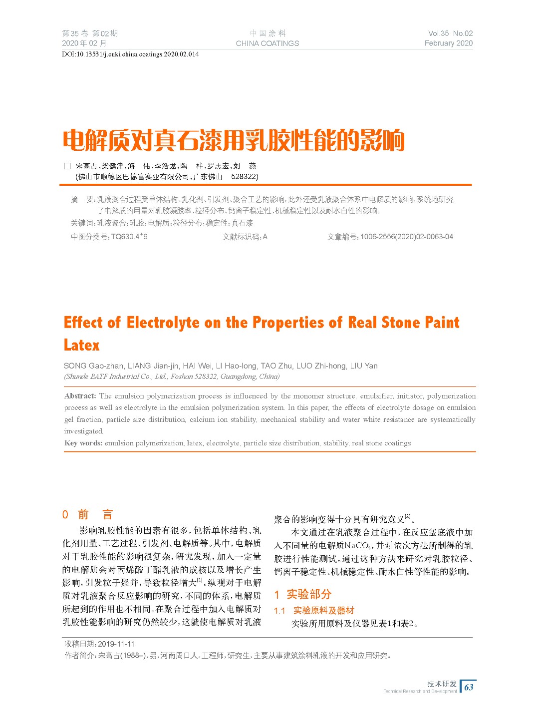 摘要:乳液聚合過程受單體結(jié)構(gòu)、乳化劑、引發(fā)劑、聚合工藝的影響,此外還受乳液聚合體系中電解質(zhì)的影響。系統(tǒng)地研究了電解質(zhì)的用量對乳膠凝膠率、粒徑分布、鈣離子穩(wěn)定性、機械穩(wěn)定性以及耐水白性的影響。