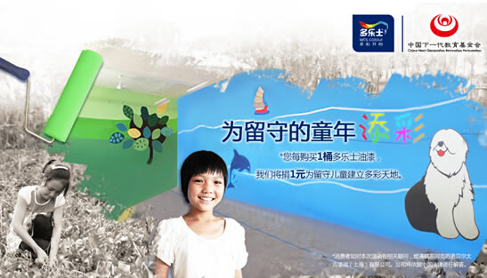 您也可登錄多樂士天貓旗艦店,每購買1桶油漆,多樂士就會為留守的孩子們捐出1元錢,用于建立更多的多樂士多彩天地。