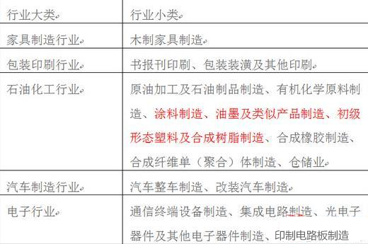 此次征收范圍涉及的5個行業(yè)大類中排放揮發(fā)性有機(jī)物的17個行業(yè)小類,具體包括:家具制造行業(yè)的木制家具制造,包裝印刷行業(yè)的書報刊印刷、包裝裝潢及其他印刷,石油化工行業(yè)的原油加工及石油制品制造、有機(jī)化學(xué)原料制造、涂料制造、油墨及類似產(chǎn)品制造、初級形態(tài)塑料及合成樹脂制造、合成橡膠制造、合成纖維單(聚合)體制造、倉儲業(yè),汽車制造行業(yè)的汽車整車制造、改裝汽車制造,電子行業(yè)的通信終端設(shè)備制造、集成電路制造、光電子器件及其他電子器件制造、印制電路板制造。