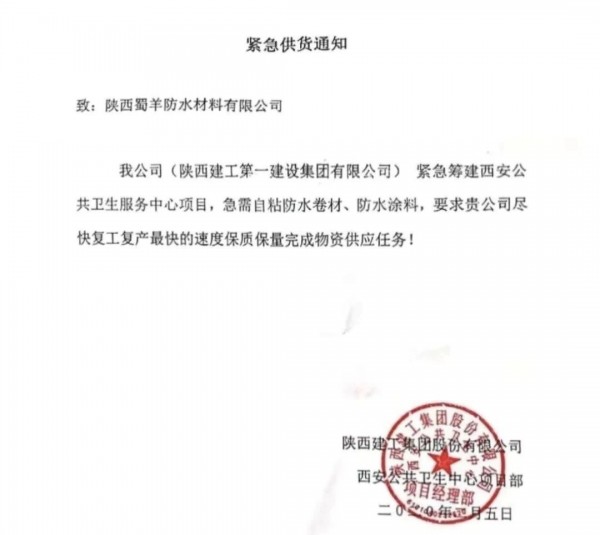 疫情面前,北新防水人一直奮戰(zhàn)在各地專業(yè)防疫醫(yī)院建設(shè)和發(fā)熱病房建設(shè)第一線。繼武漢火神山、鄭州小湯山等重大項目援建之后,2月6日,滿載北新蜀羊防水材料的貨車駛?cè)胛靼舶妗靶健贬t(yī)院工地。西安公共衛(wèi)生中心項目占地500畝,對標4A標準建設(shè),1月31日晚上通知建設(shè)單位進場,北新建材將為西安版“小湯山”醫(yī)院提供北新防水材料和龍牌石膏板輕鋼龍骨墻體吊頂系統(tǒng)、涂料、粉料砂漿等全套優(yōu)質(zhì)環(huán)保新材料捐贈援建,全力支持打贏這場防疫攻堅戰(zhàn)。