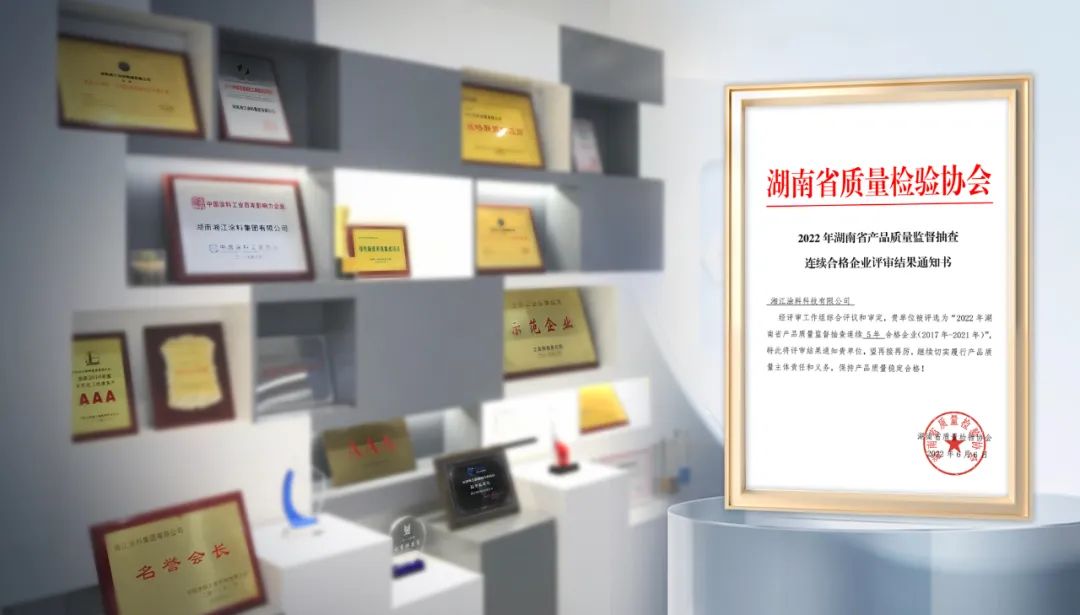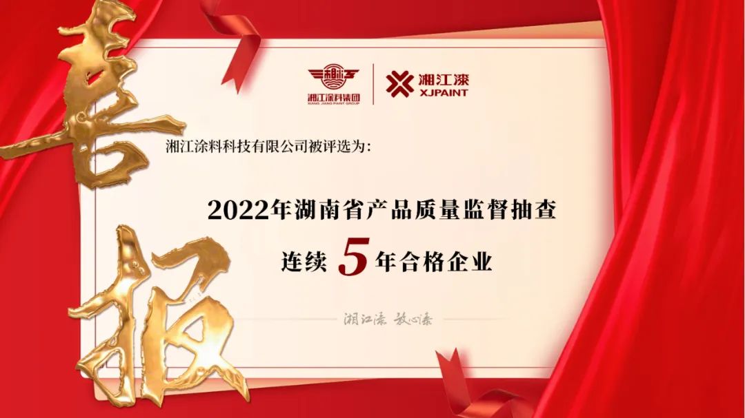2022年6月,湘江涂料科技有限公司被評選為“2022 年湖南省產(chǎn)品質量監(jiān)督抽查連續(xù)5年合格企業(yè)(2017 年-2021 年)”