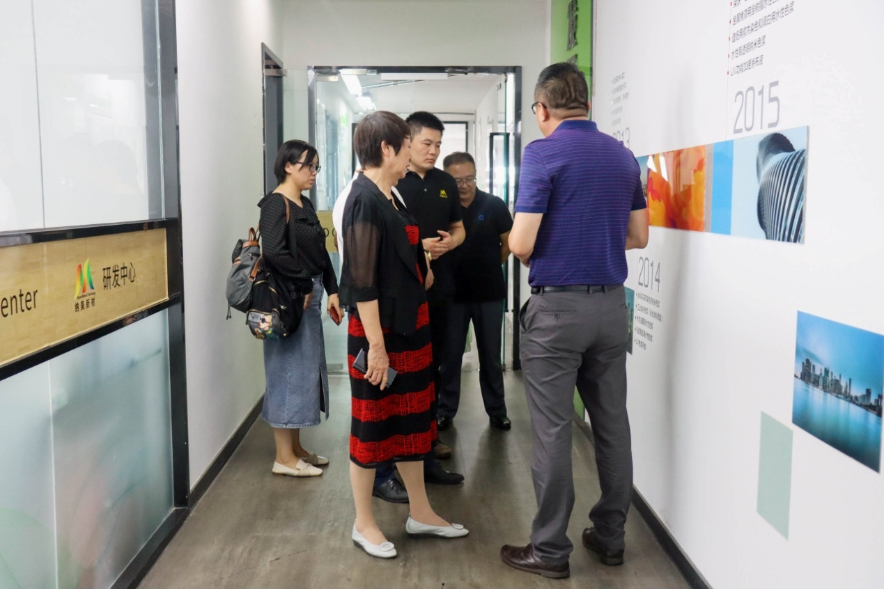 在納美新材董事長趙磊先生的陪同下,孫蓮英會長一行走進公司研發中心,了解水性工業涂料的研發生產和銷售情況。在研發中心,趙磊先生向孫蓮英會長一行介紹了研發中心、企業研究院、企業技術中心、院士工作站及博士后工作站等企業科研平臺建設、企業研發人員構成及配比、企業新產品研發成果等情況。納美新材通過與國內外科研機構及高校開展合作,推動成果轉化,產品不斷迭代更新,發展勢頭迅猛。