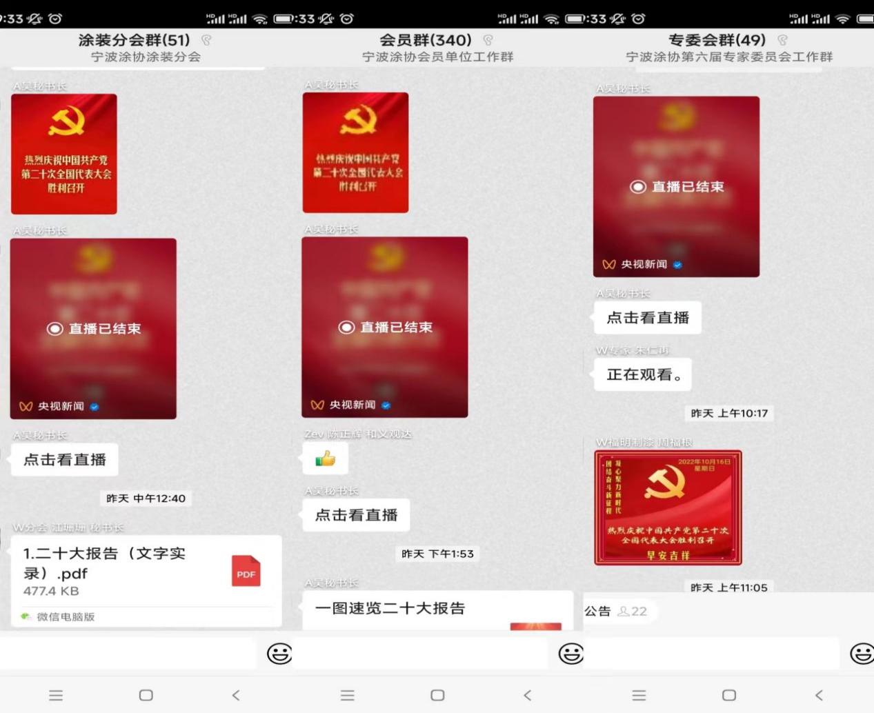10月16日,寧波涂協(xié)組織全體黨員、入黨積極分子和秘書處全體工作人員滿懷激動(dòng)的心情專心致志地觀看中國共產(chǎn)黨第二十次全國代表大會(huì)直播,同時(shí)在各個(gè)會(huì)員工作群積極發(fā)動(dòng)會(huì)員企業(yè)組織觀看。