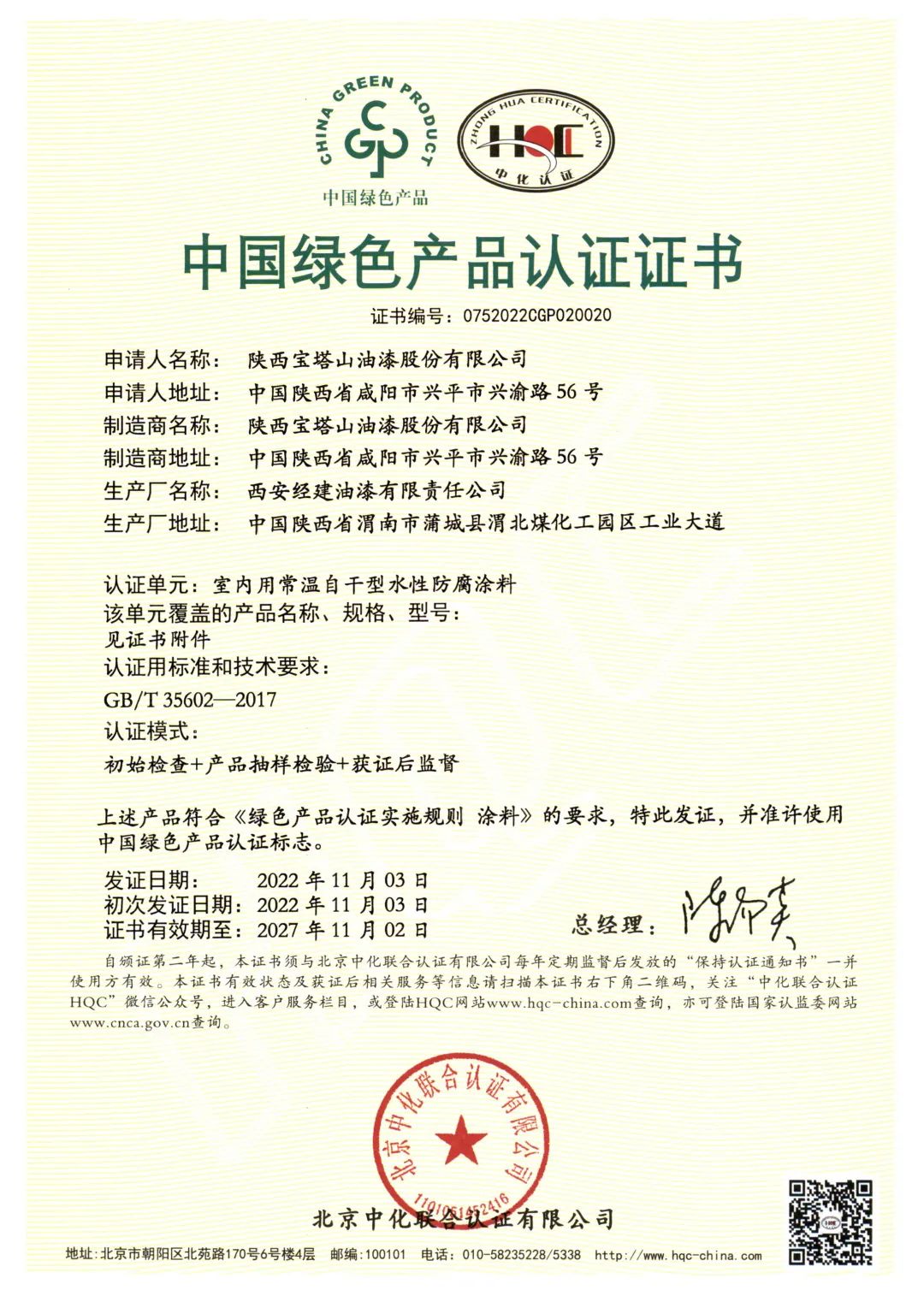 綠色產品|寶塔山漆11款水性涂料獲中國綠色產品認證