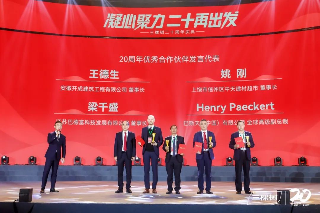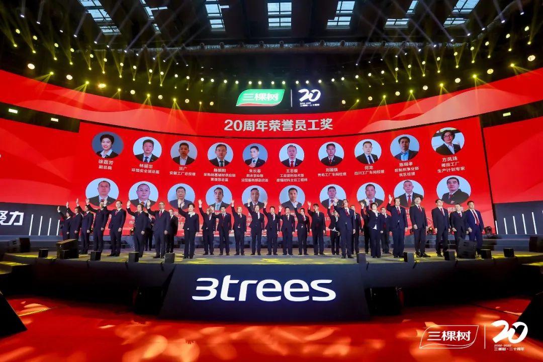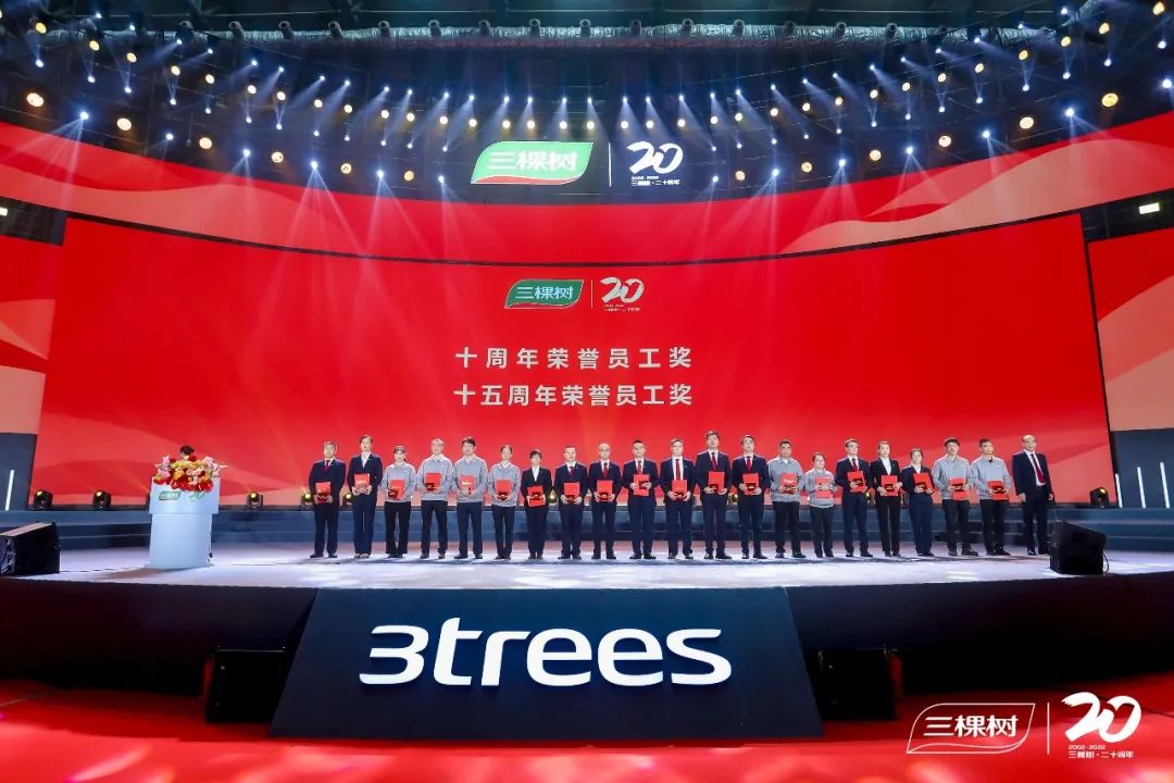 在表彰環(huán)節(jié),60名合作伙伴獲得三棵樹“20周年優(yōu)秀合作伙伴”榮譽(yù);20名三棵樹奮斗者獲頒“20周年貢獻(xiàn)獎”,另有20名陪伴三棵樹20年一起成長的奮斗者獲頒“20周年榮譽(yù)員工獎”。多名合作伙伴代表上臺領(lǐng)獎并發(fā)表感言,2名員工代表做了深情分享。投融資機(jī)構(gòu)代表發(fā)表致辭,高度評價(jià)了三棵樹在資本市場的良好表現(xiàn)。